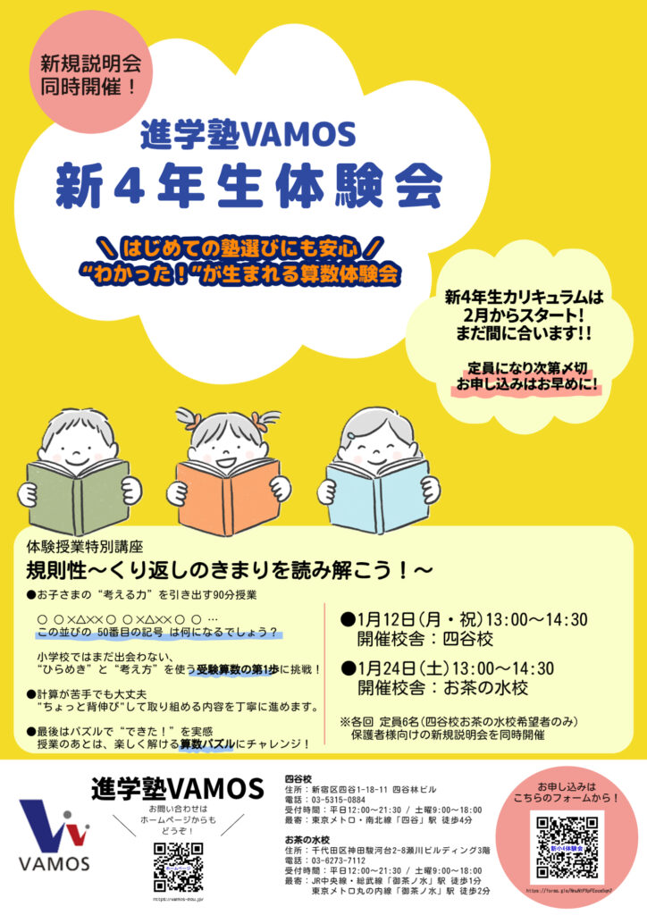 この度、新4年生の四谷校、お茶の水校入塾希望の方を対象に体験会(算数)を行います。